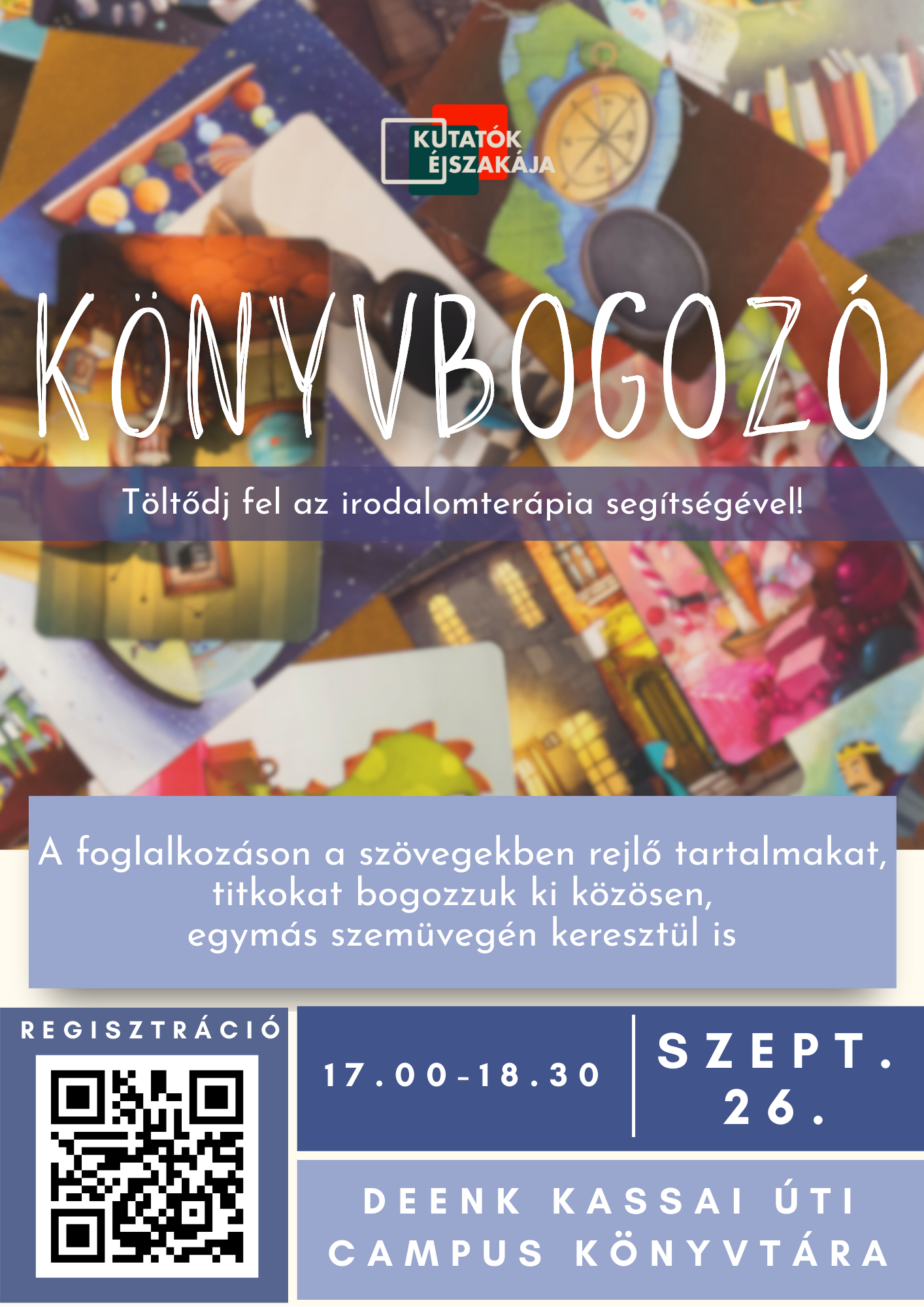 Töltődj fel az irodalomterápia segítségével! A foglalkozáson a szövegekben rejlő tartalmakat, titkokat bogozzuk ki közösen, egymás szemüvegén keresztül. A foglakozást vezeti: Braun Krisztina biblioterapeuta.