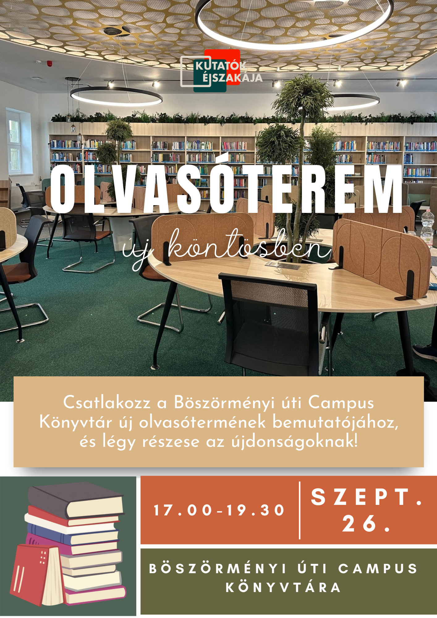 Bemutatjuk a Böszörményi úti Campus Könyvtár megújult olvasótermét. Ízelítőt adunk, hogy milyen új szolgáltatásokkal, szakirodalmi válogatással várjuk a hallgatókat és a kutatókat a megújult könyvtári térben.