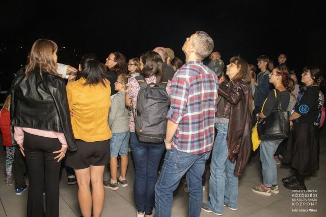 Az előadó lézermutatóval segít eligazodni a csillagos égbolton